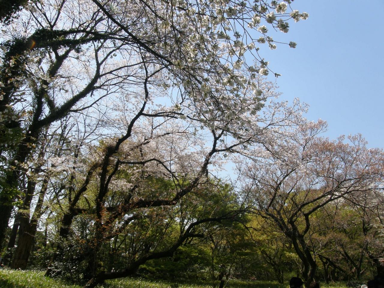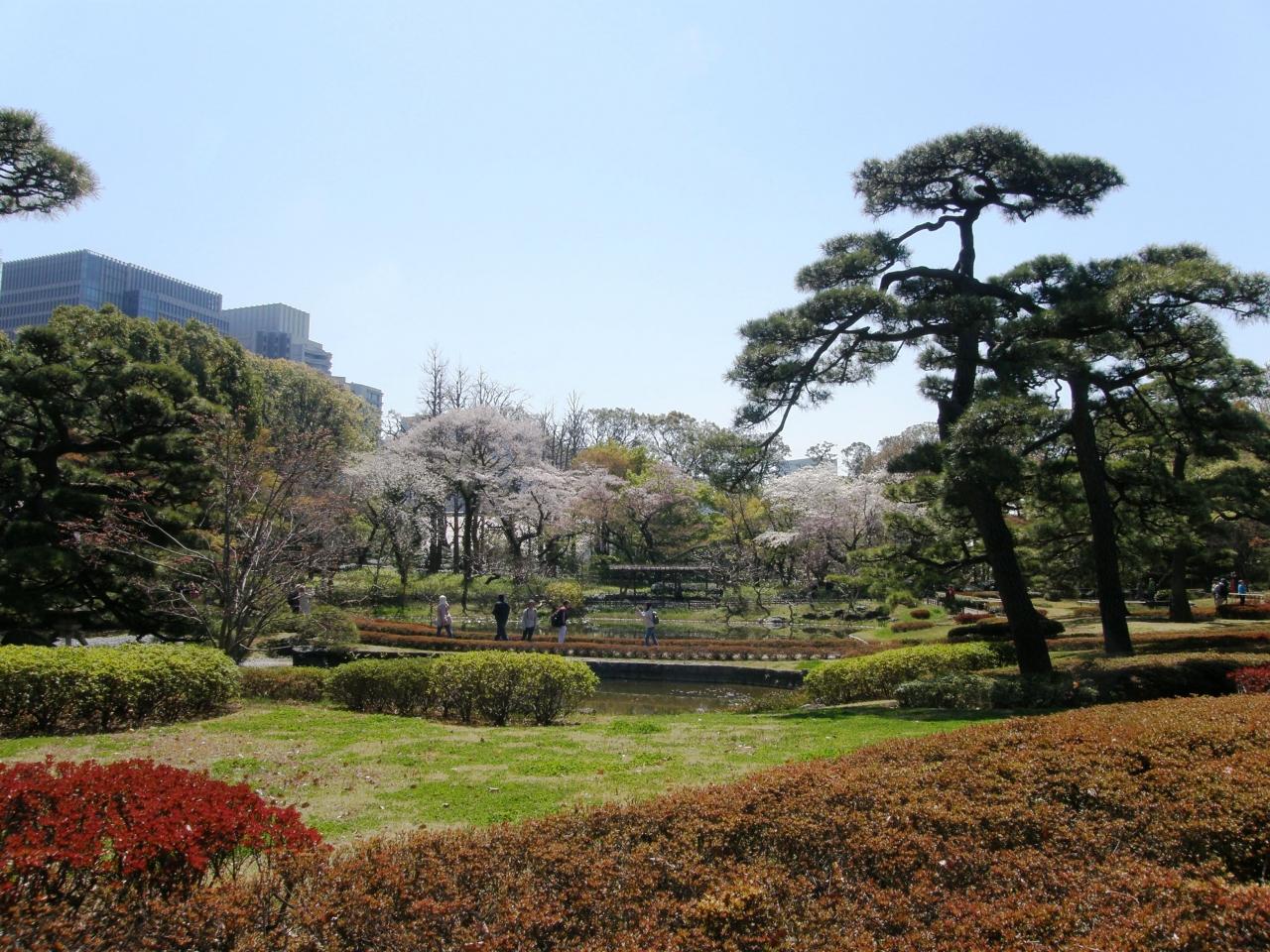 大きなビルにのみ込まれ、桜が満開ですが、桜の木が小さく見えます