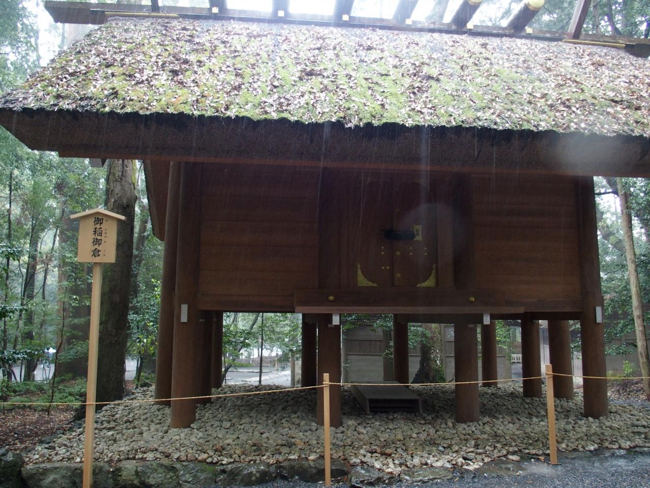 三節祭でお供えされる神田で収穫されたお米が納められています。神明造の特徴をうかがうことができます。(伊勢神宮HPより) -