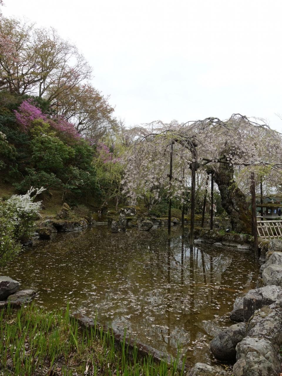 池の向こうから、枝垂れ桜の枝越しに見たお庭。