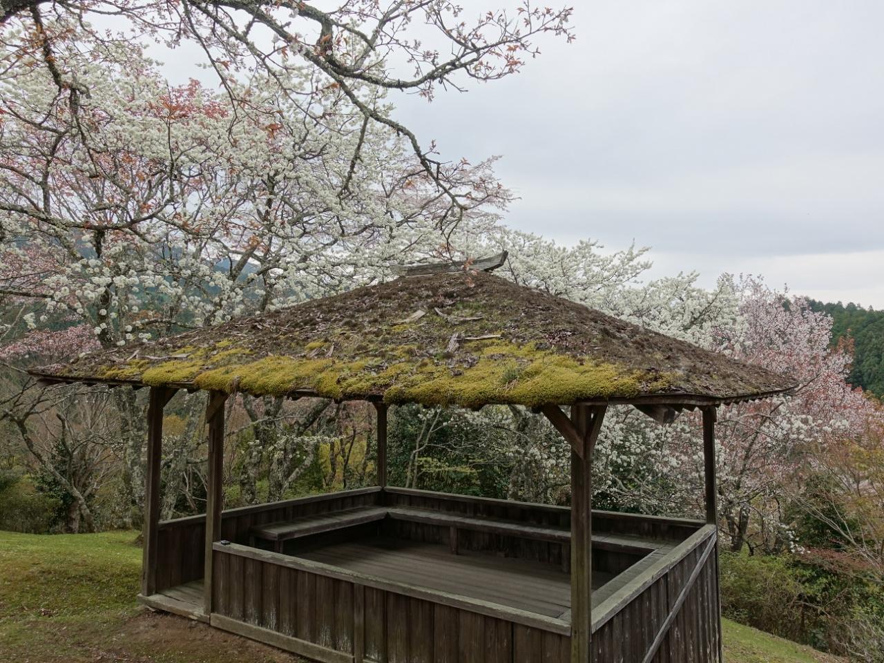 築山に登ってみました。苔むした東屋と桜の対比も美しい。