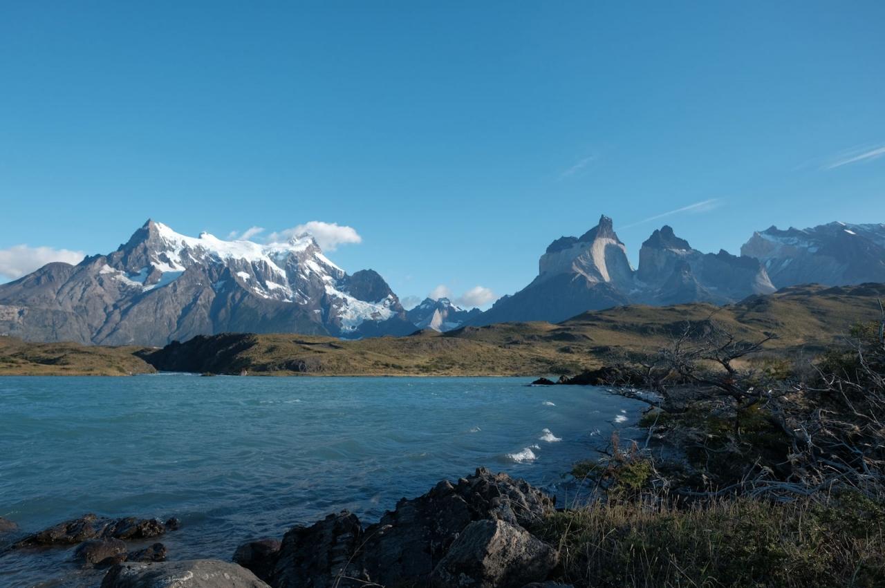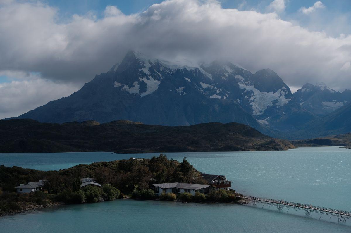 道を進むとさっきの橋の向こうにトレスデルパイネの山々が・・・