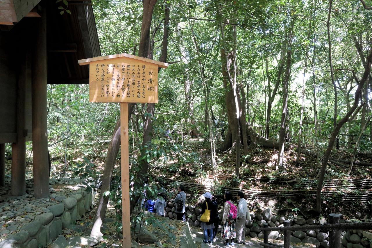 湧き水の中にある苔むした岩は楊貴妃の石塔の一部ともいわれ、三度水をかけて願い事をすると願いがかなうとか。