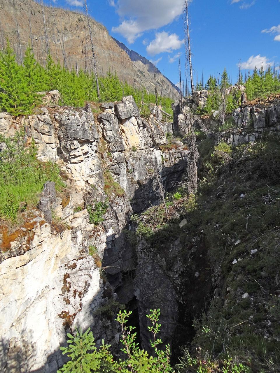 氷河がプロスペクターズ渓谷を後退したとき、融けた水が激流となって解放されました。このとき石灰岩の割れ目は自然な流路を提供しました。水は渓谷を流れ落ち、その縁を越えてバーミリオン川に流れ落ちました。」
