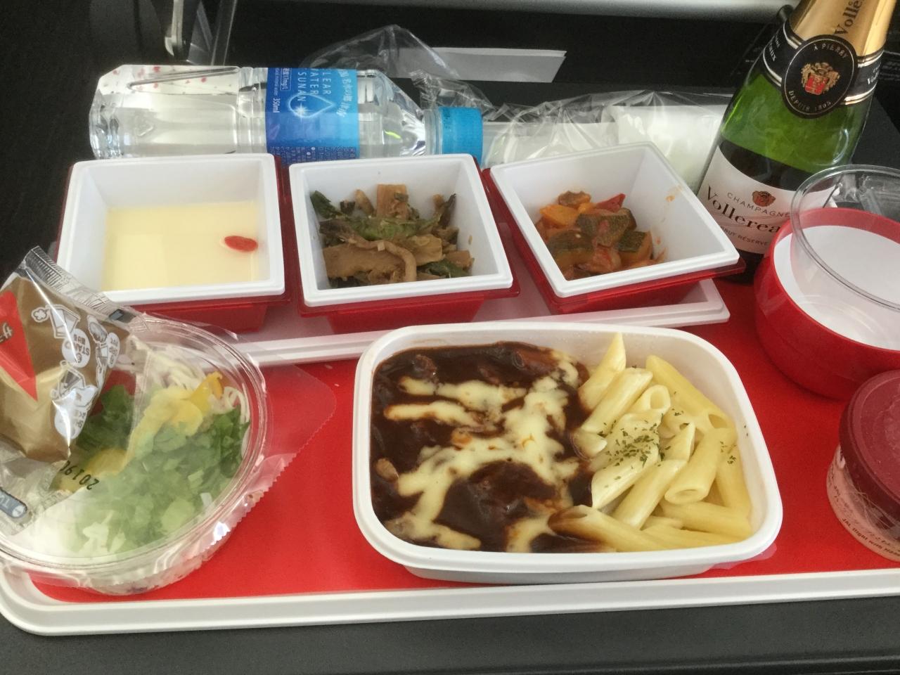 一部では「学食スタイル」と揶揄されている新サービス「JAL's Table」。まずはヘルシーにサラダプレートをオーダー。飲み物はビュッフェコーナーにあるドリンクエリアからシャンパーニュを持ってきました。