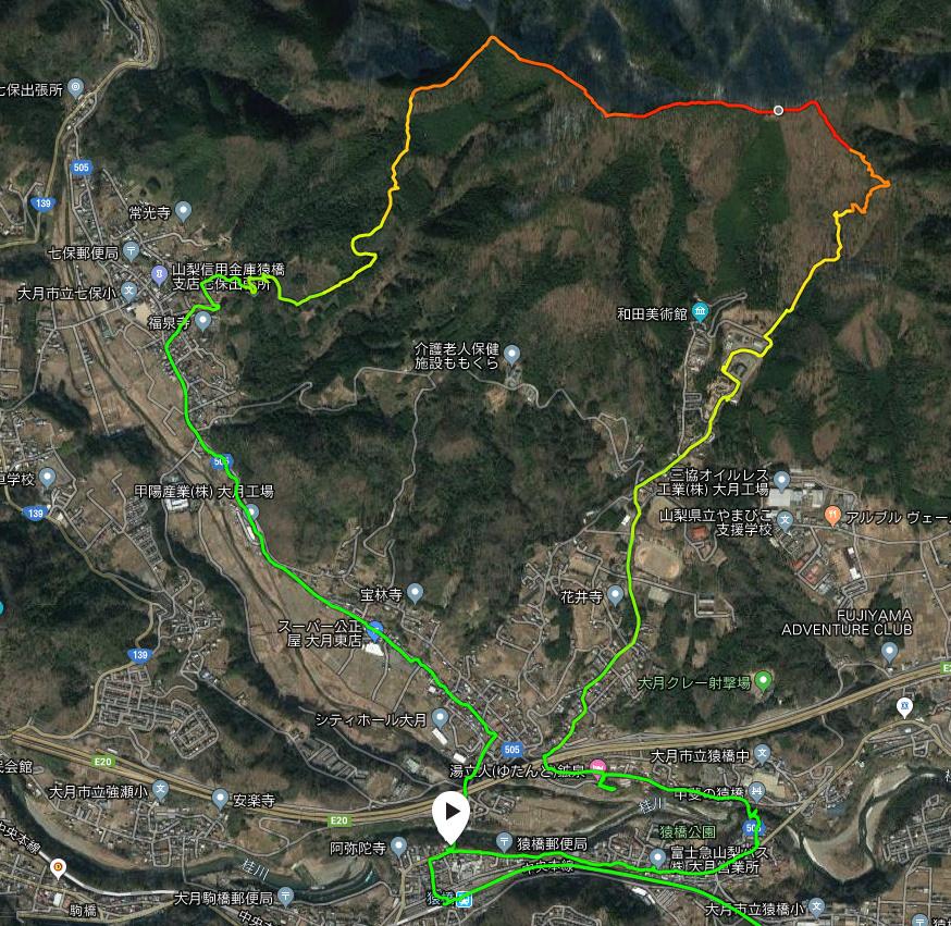 今回のトレッキンがは、JR猿橋駅より歩いて葛野登山口~百蔵山山頂~東ルート登山口~日帰り入浴施設「湯立人(ゆたんど)鉱泉」~名勝 猿橋~JR猿橋駅へ戻るコース。 -