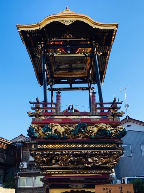東上町の曳山は「鶴舞山(つるまいやま)」とよばれ、金色の彫刻が美しい。