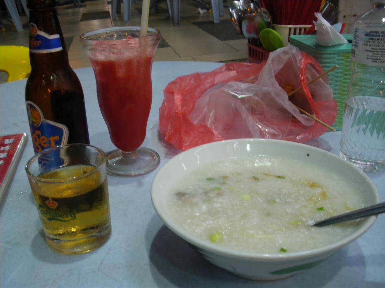 なぜだかお粥が美味しそうだと思い、タイガービールとともに。串焼きもその辺で買って食す。