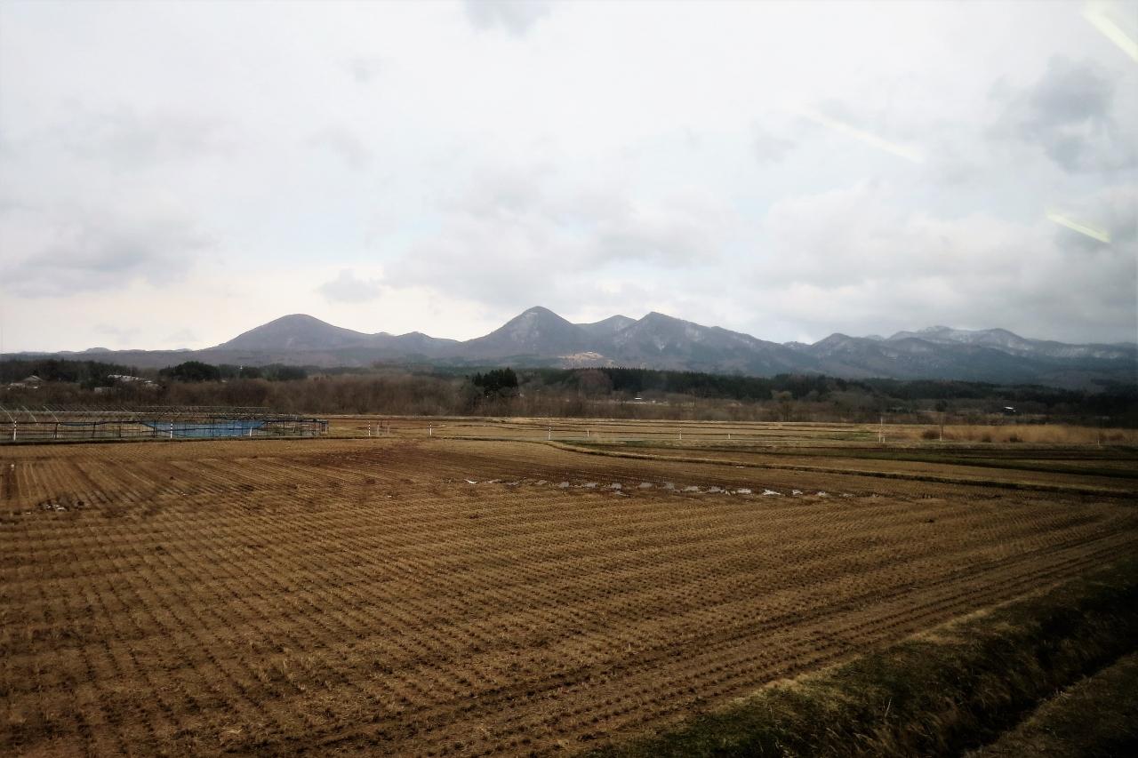 遠くに見える山並みは、平舘山地(標高561m~718m)です。 -