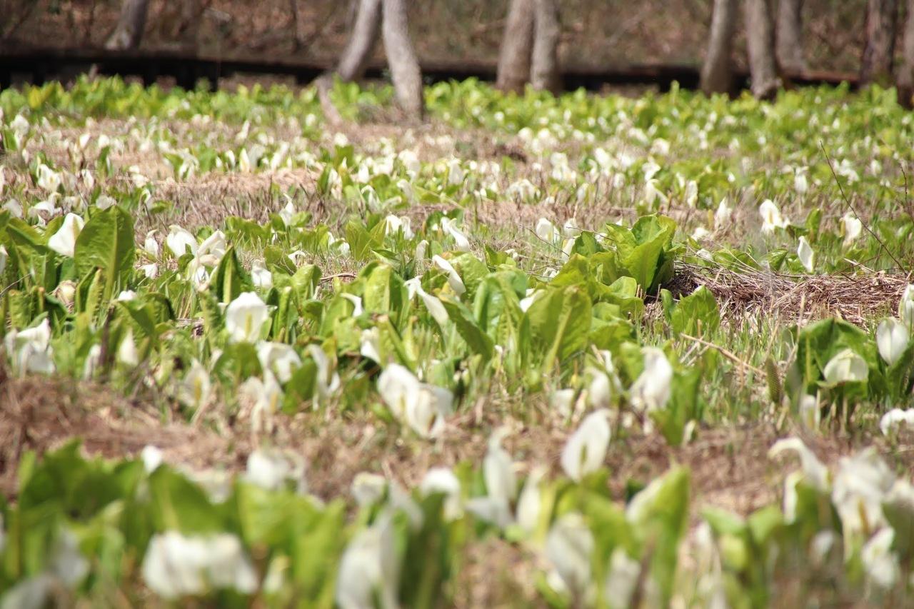 普通の水芭蕉は、仏炎包と呼ばれる、白い花びらのような部分が1枚なのですが、オチクラ水芭蕉は2枚あります。 -