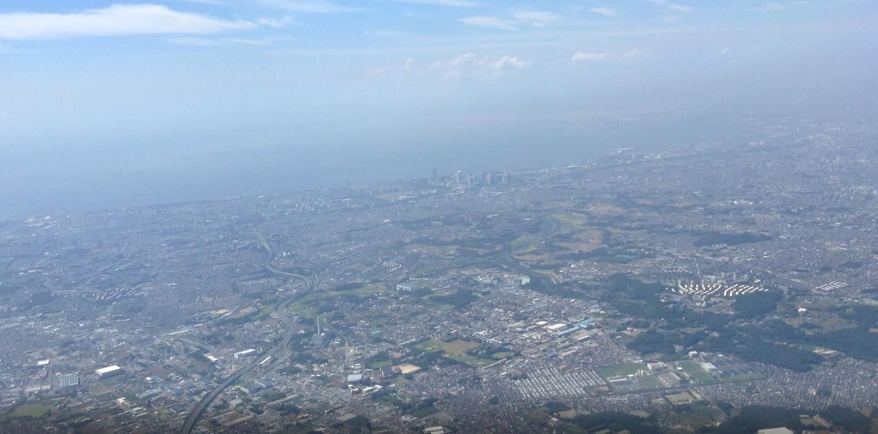 これは着陸も近い千葉市上空。海沿いに幕張新都心が。