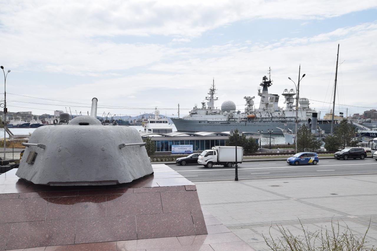右手は港に係留されているクラースヌィ・ヴィムベル軍艦。