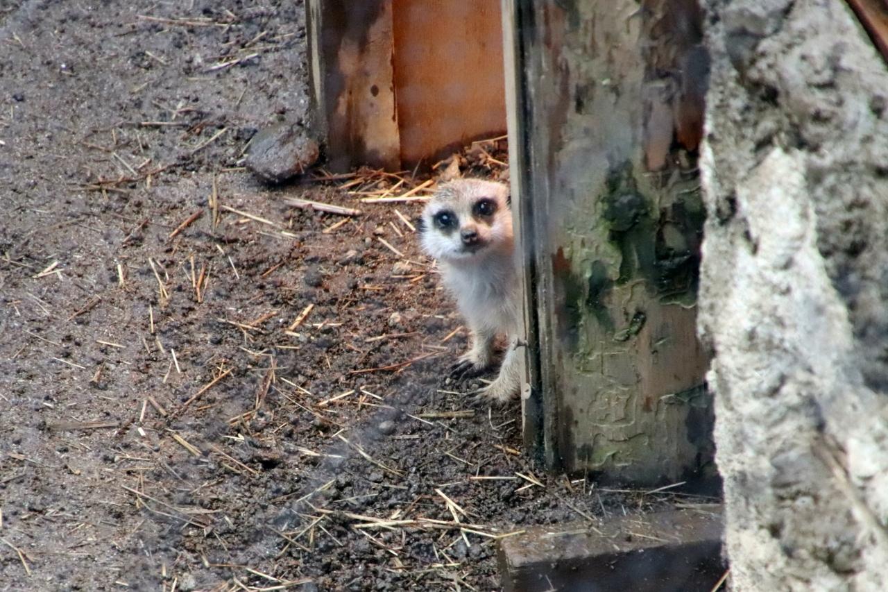 ミーアキャットの赤ちゃんは、アニマルボートツアーのボートで島に近づいたときはよく見えなかったのですが、ツアーが終わった後で、池に架かる橋の上から島を見下ろした時、ちょうど赤ちゃんが巣から出てきたところが見られました!