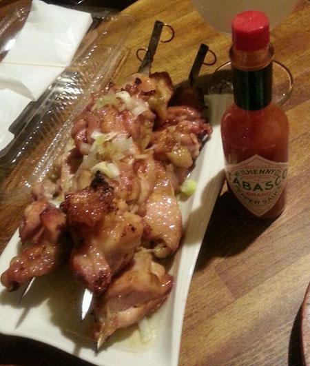 そしていつもの鶏のオイル焼きネギソース。巨大な串焼きはいつも一本しか食べられません。