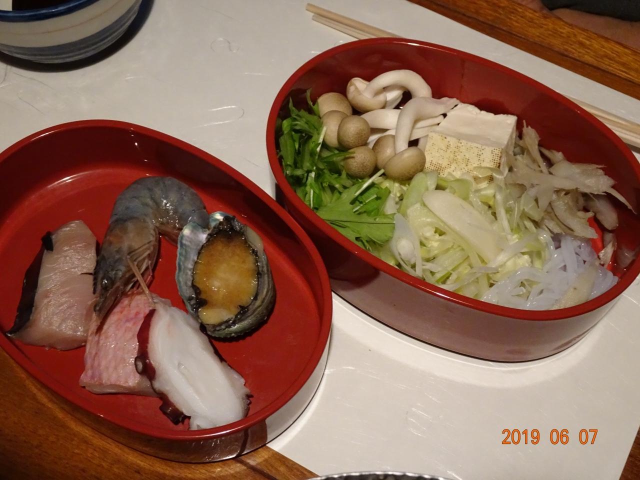 ④海鮮寄せなべ、蝦夷鮑、海老、金目鯛、たこ -
