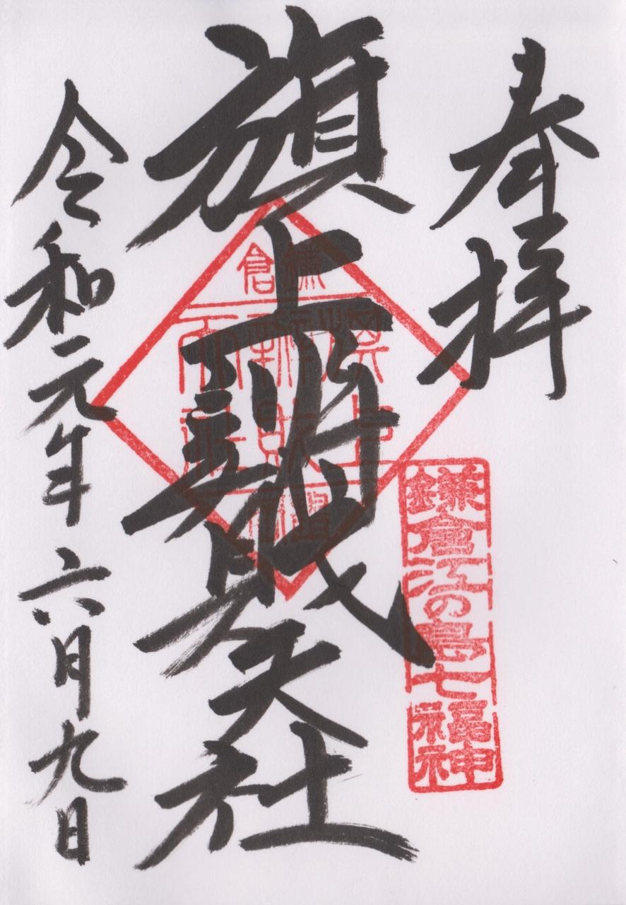 西側の入口から入ると、あの大石段を昇らずして本宮(上宮)の左側に出ました。近くには八幡宮の総本宮である宇佐神宮(大分県)の遥拝所もあります。お詣りをした後、大石段を下って左にある祈祷受付奥(若宮・下宮寄り)で御朱印をいただきました。日曜昼で十数名の待ち列でした。さらに参道を南下し、源平池(蓮が密生する様子は上野不忍池のようです)に浮かぶ島に建つ旗上辨財天社にもお参りして御朱印もいただきました。