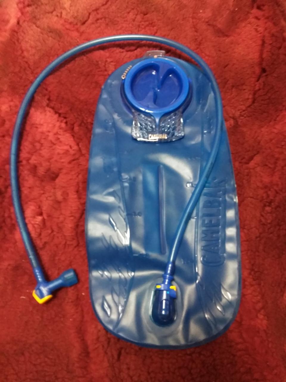 キャメルバッグ:トレッキング中の水分補給システムです。容量はいろいろありますが、これは2リットルサイズ。この袋(タンク)に適当な量のミネラルウォーターと、ライムをひと搾りしています。これを簡易リュックに納め、専用のチューブ(青い管)を引っ張り出せば、歩きながら、運転しながら、常時、水分補給することが出来ます。