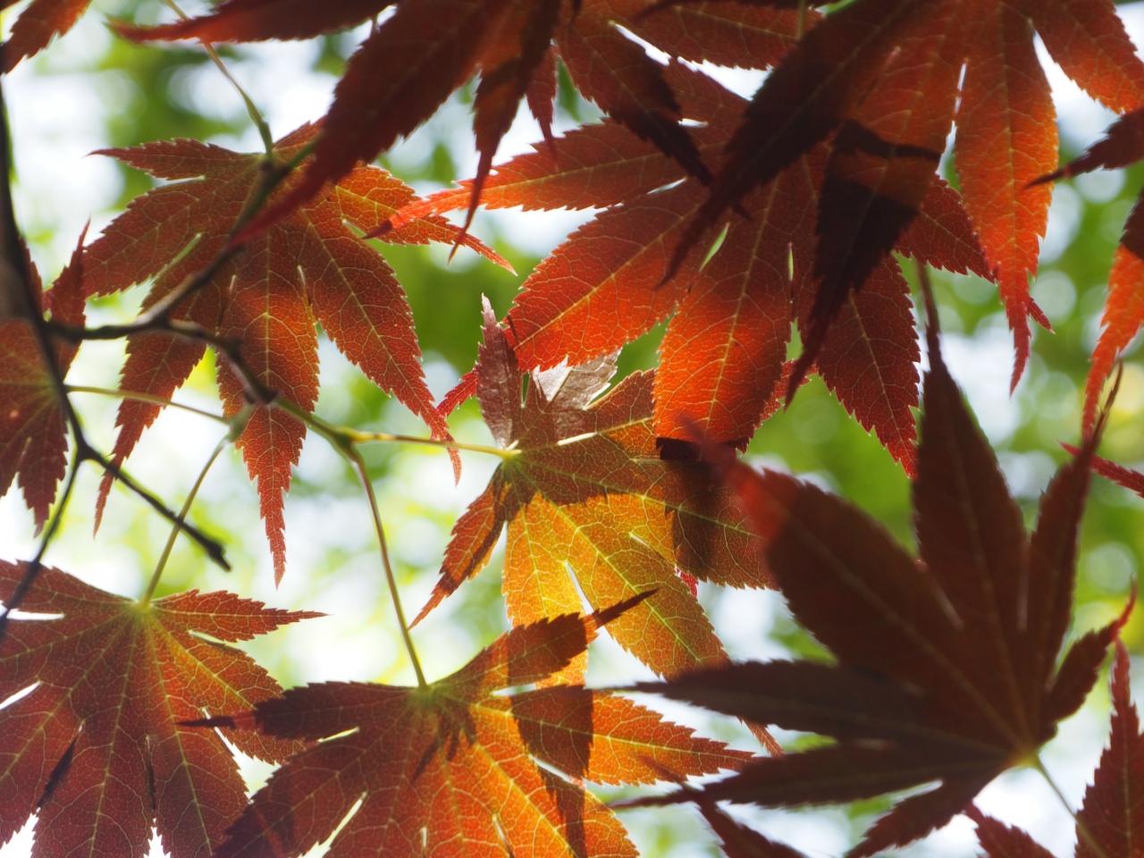 一部色づいたもみじと鮮やかな若草色のもみじとのコラボが