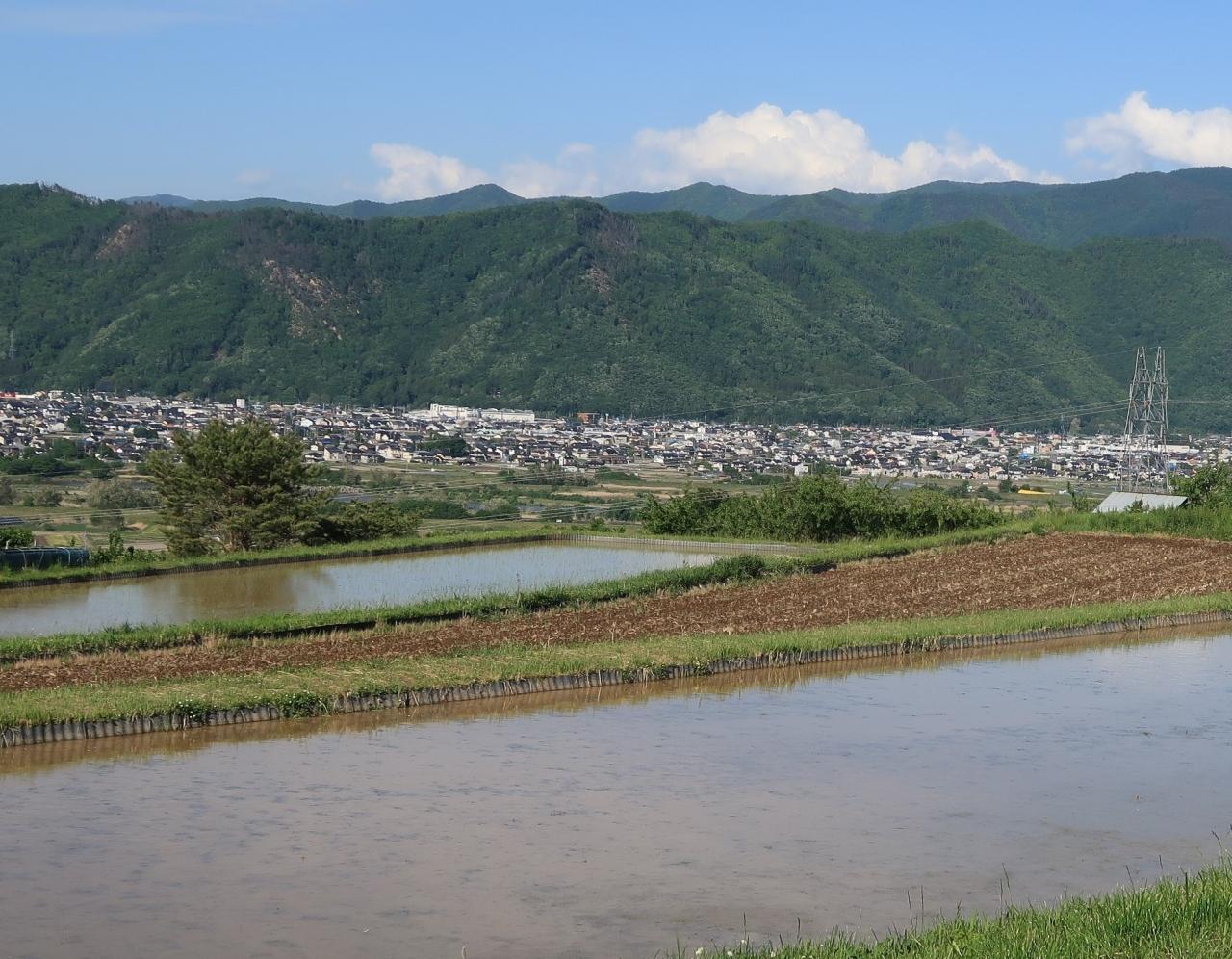 姨捨の棚田は、我が国で初めて文化財指定を受けた農耕地、棚田が織り成す文化的景観です。棚田は、冠着山(1,252m)や三峰山(1,131m)などを中心とする聖山高原を背に善光寺平を一望する標高460mから560mに至る面積約40ha、約1,500枚の棚田が残っています。16世紀半ばから造られていった棚田は、特に江戸時代には文学・絵画の題材に取り上げられるなど、文化的景観の優れたものとして指定を受けたものです。