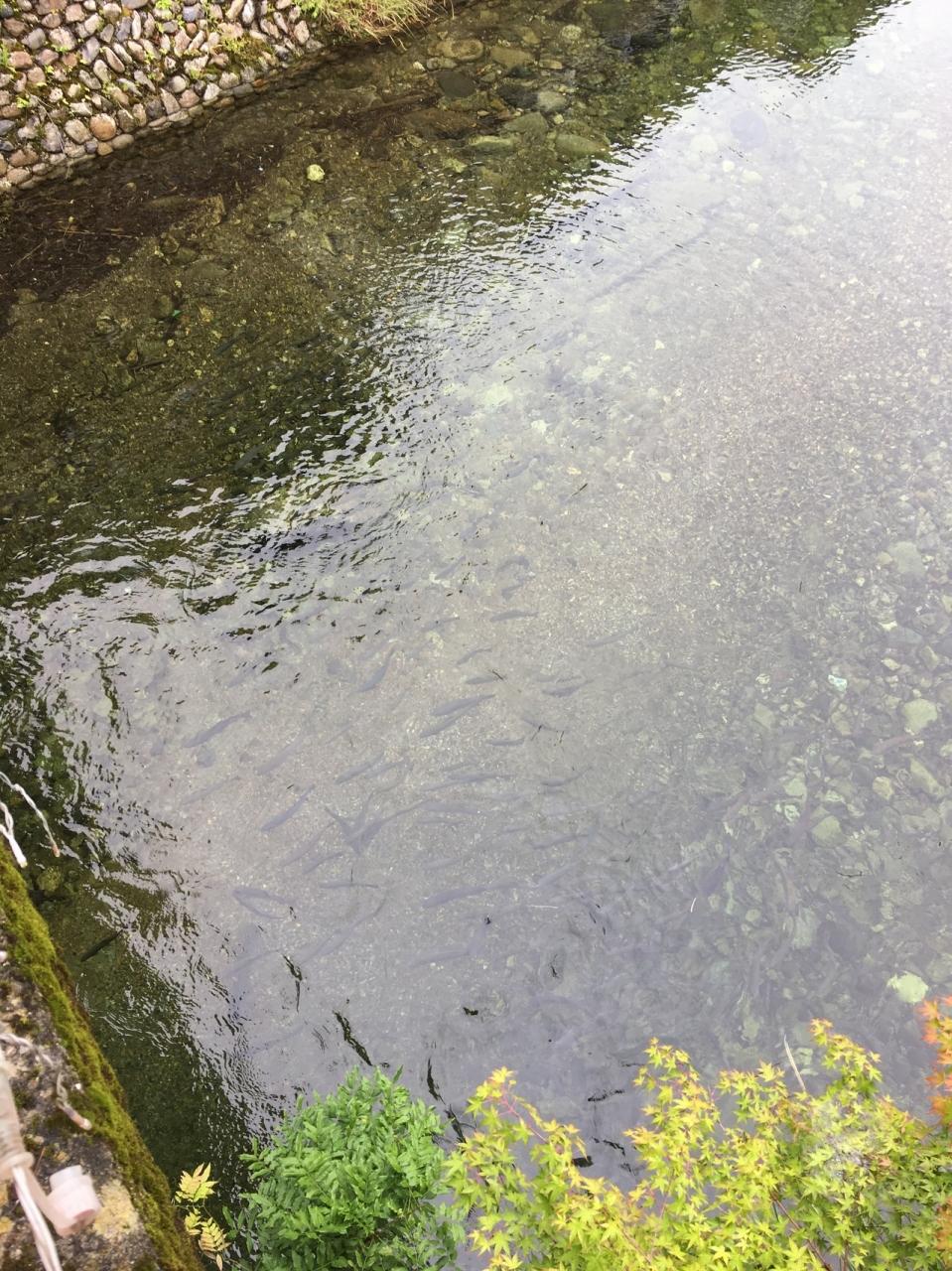近所の川なら鯉ですが、こちら清流ですので「ニジマス」