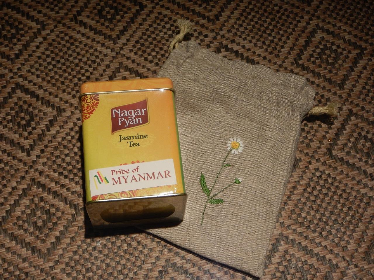 翌日は、ヤンゴンを観光して日本に戻ります。荷物を整理しながら、アウンさんから頂いたお土産(ミャンマーのジャスミンティー)を取り出しました。袋の刺繍が綺麗です。日本に帰ったら、このお茶を飲みながら、次の旅について考えるつもりです。