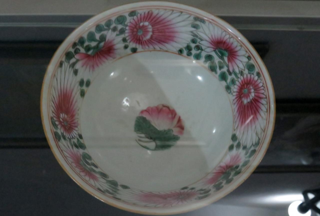 白地に赤い花が描かれたお椀のズームアップ光景です。現在も制作されている、新しい磁器製品のようでした。周辺部の花柄は、中心部が赤い、白い花でした。