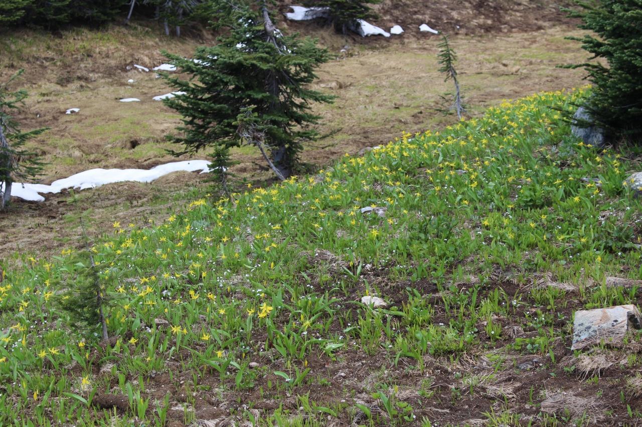 7月初旬、高山植物は咲き始めたばかりでしたが、グレイシャーリリーやインディアン・ペイントブラシ、ウエスタンアネモネなど、雪解けしたばかりの場所で頑張って花開いていました。