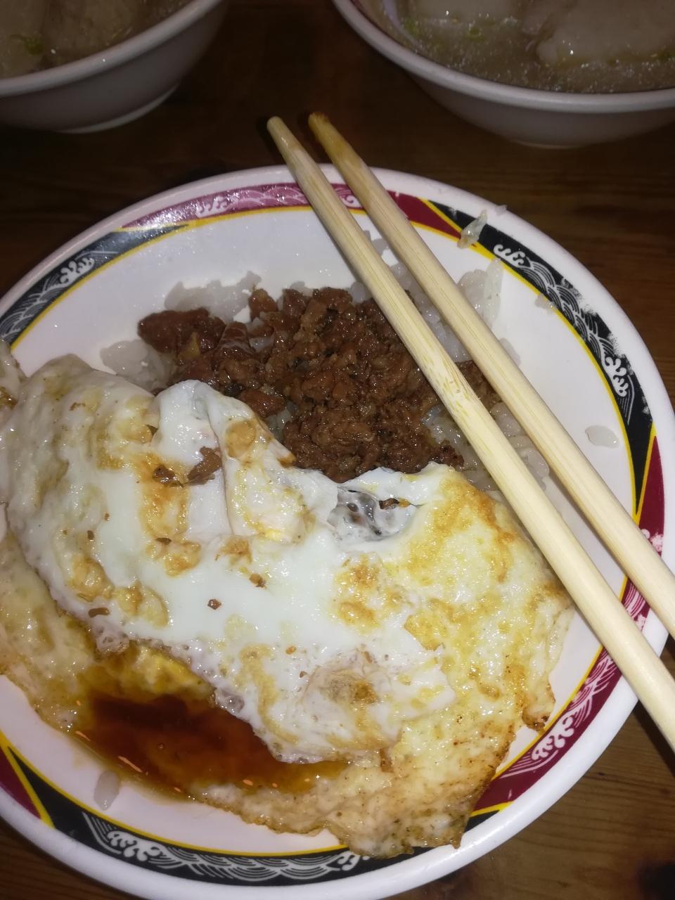 半熟の目玉焼きがお肉に絡まると絶品です。天天利美食坊 地元の料理