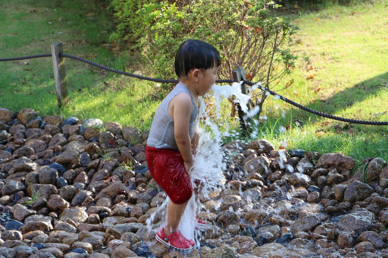すでに夕方でだいたい午後5時ぐらい。それでもまだ暑い。噴水は子供にとっていい遊び相手。