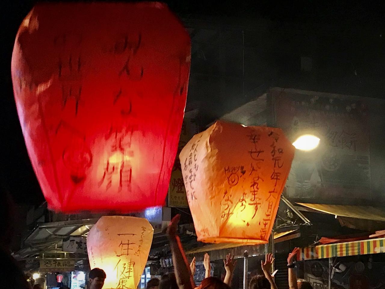 真っ暗な空に沢山のランタンが浮かび上がって幻想的