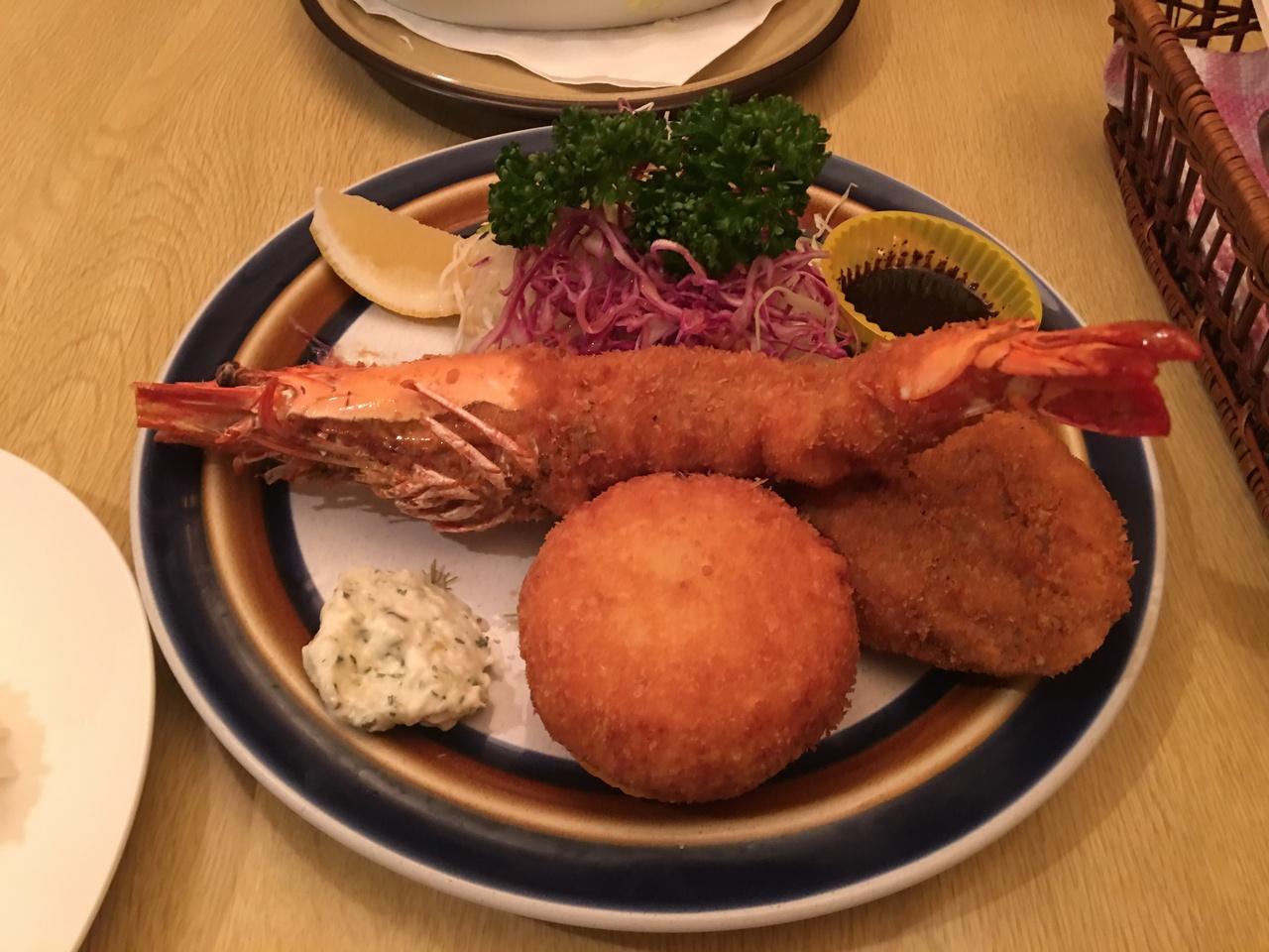 カニクリームコロッケとえびフライとヒレカツのセットをオーダーしましたが、えびフライは身が大きくてぷりっぷり。ヒレカツもジューシー。