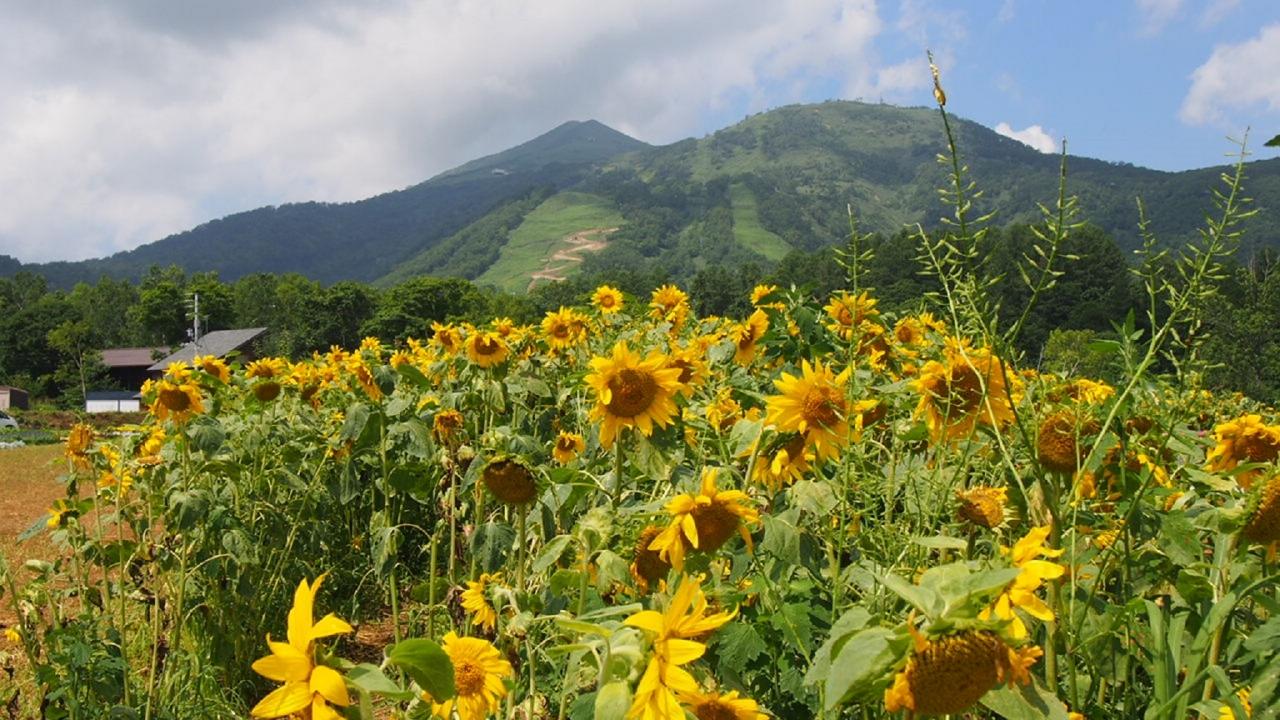 向日葵が一面に咲き、バックに羊蹄山。