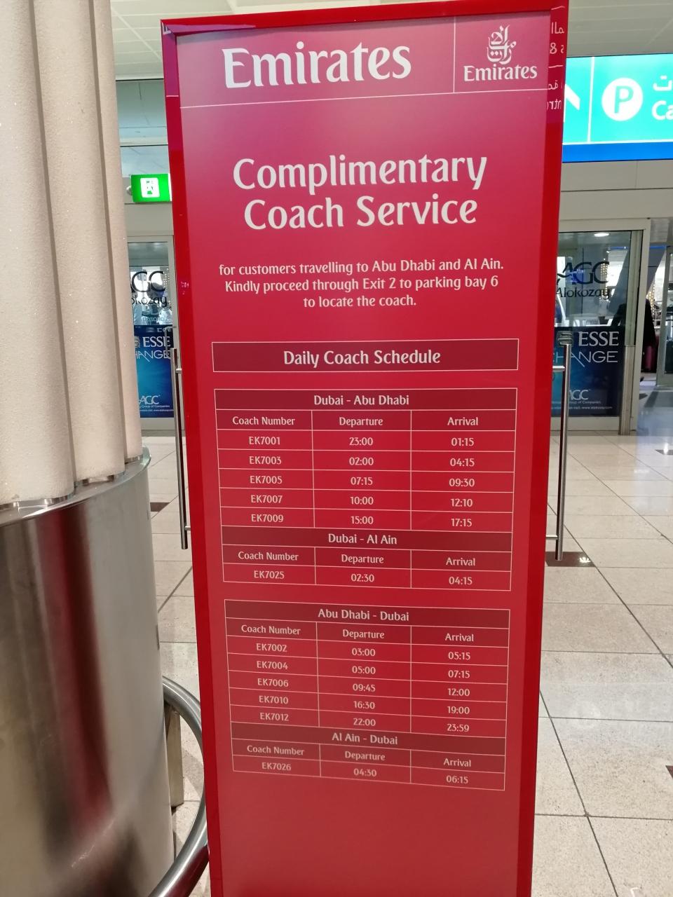 これは、到着ロビーに掲示されていた「Emirates Complimentary Coach Service」の時刻表。