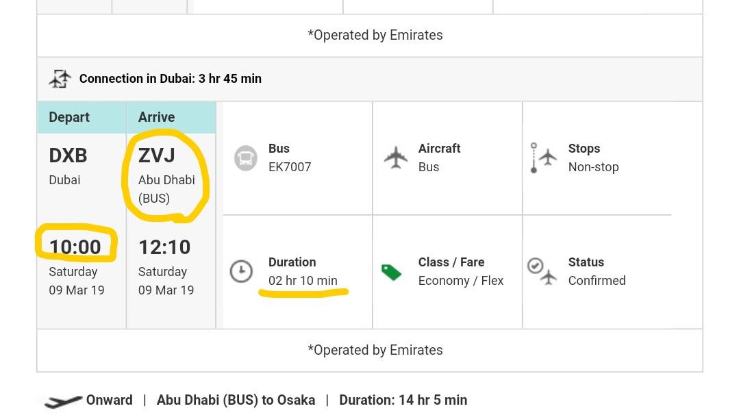 ここで注目したいのは、アブダビ行きの出発時間は10:00、到着は12:10になっています。