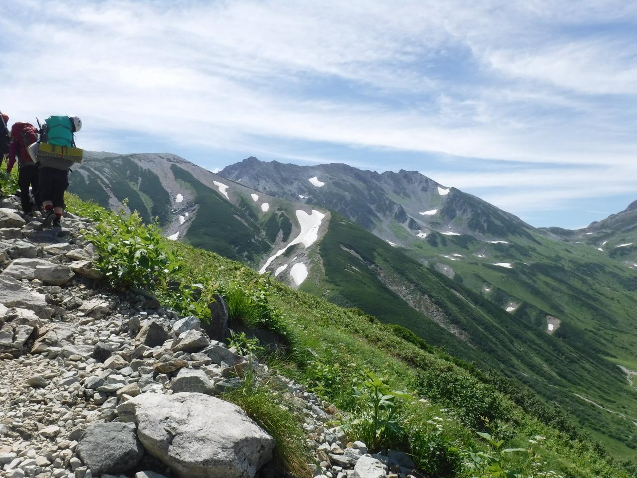 劔沢キャンプ場に向けて出発。写真は立山連峰。