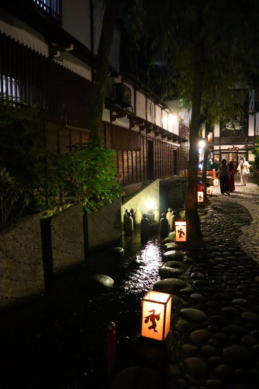 柳の木の下、小石が敷き詰められた小径に淡い提灯の灯りの下、涼し気に水が流れる水路があり、憩いの場所になっています。やなか水のこみち 公園・植物園