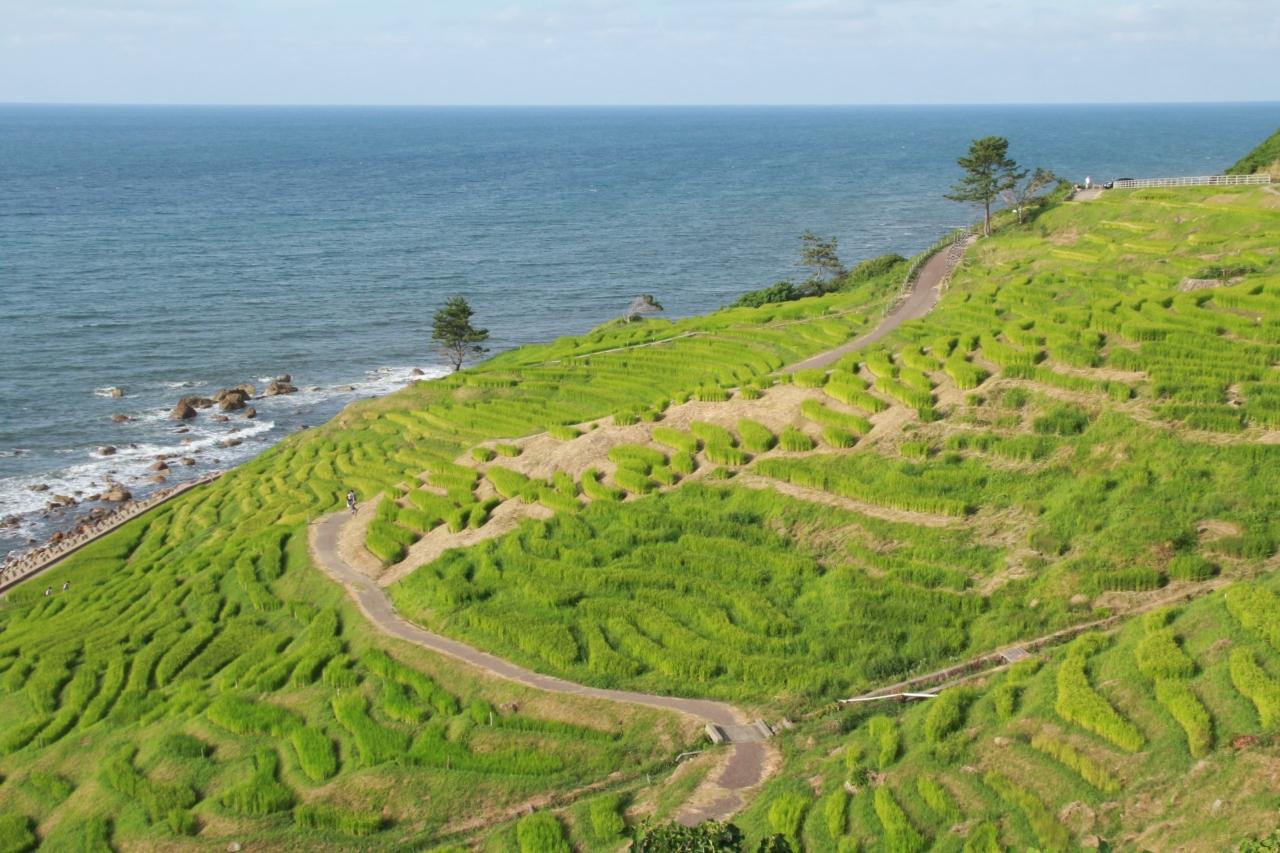 日本海の海岸から小高い山に向かう急斜面に作られた、白米千枚田。