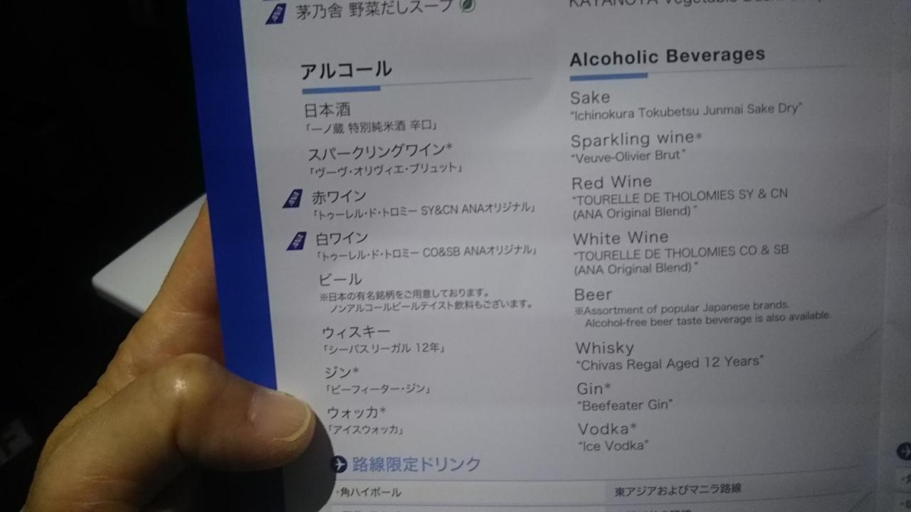座席のしおりに食べ物・飲み物のリストが記載されているのは有り難いところ。何でも注文できます。
