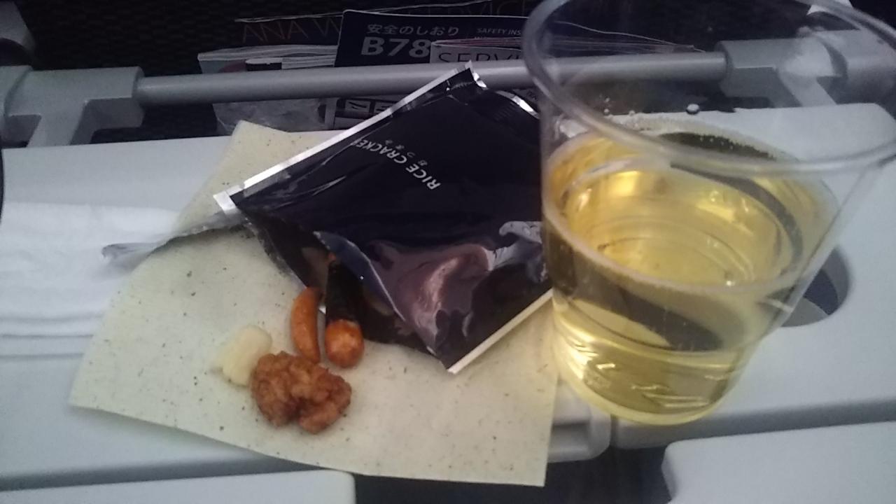 離陸30分後にドリンクサービス。最初は白ワインにしました。スナックとともに。