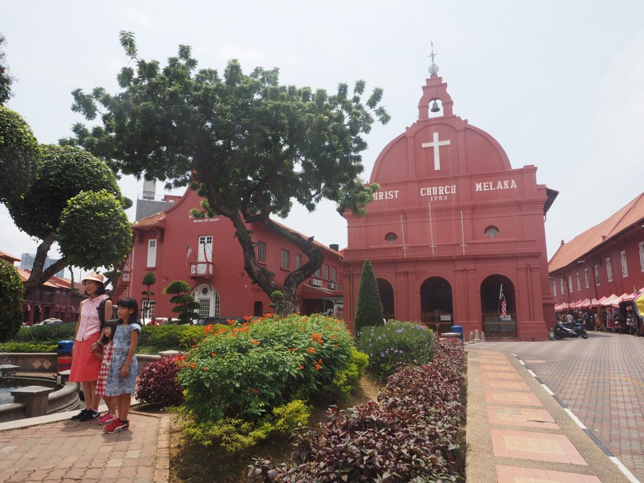 マラッカのシンボルとも言えるピンクがかった赤い壁に白い十字架が特徴的なキリマラッカキリスト教会。