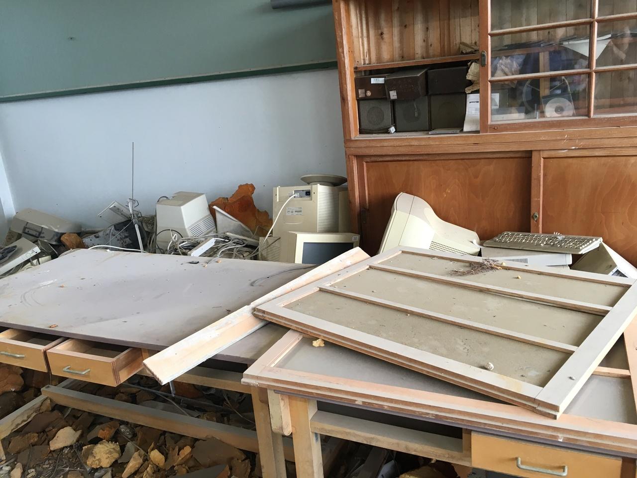高校の4階建の校舎。教室がめちゃくちゃになっていて、瓦礫が散らばっていた。 -