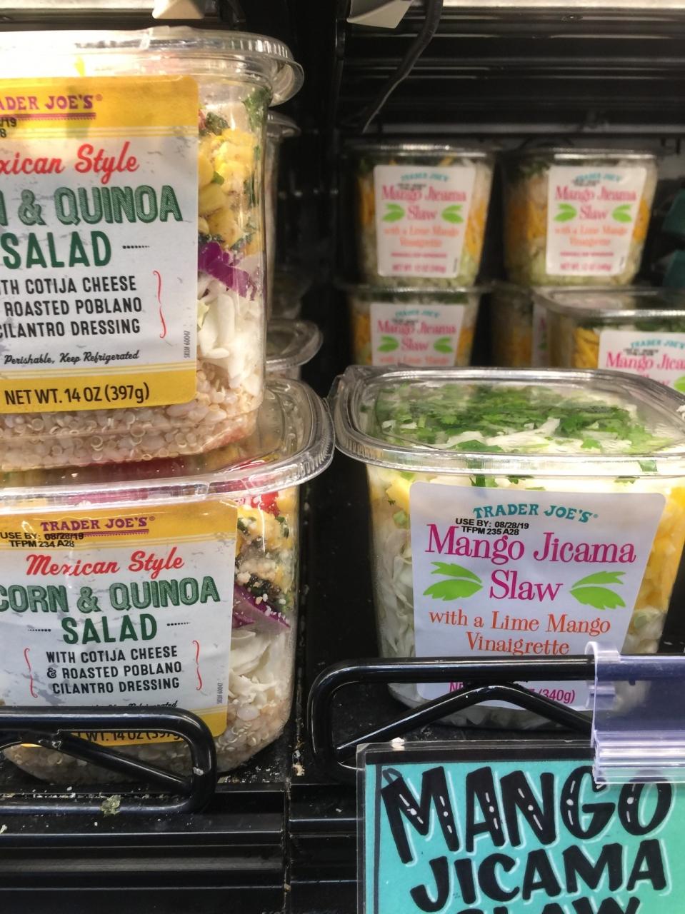 トレーダージョーズ サラダの品揃えがありがたいの、、これは新製品でコーンキンアキャベツサラダとマンゴーヒカマサラダ、キンアはキヌアと綴るのにキンアと発音せよ、と悩ましい笑