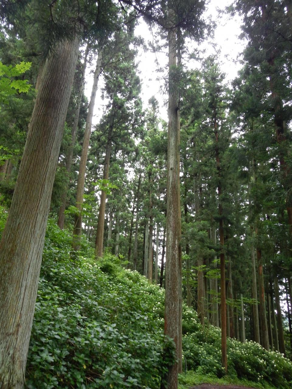 真っすぐ伸びる杉木立の足元に無数のアジサイの花。