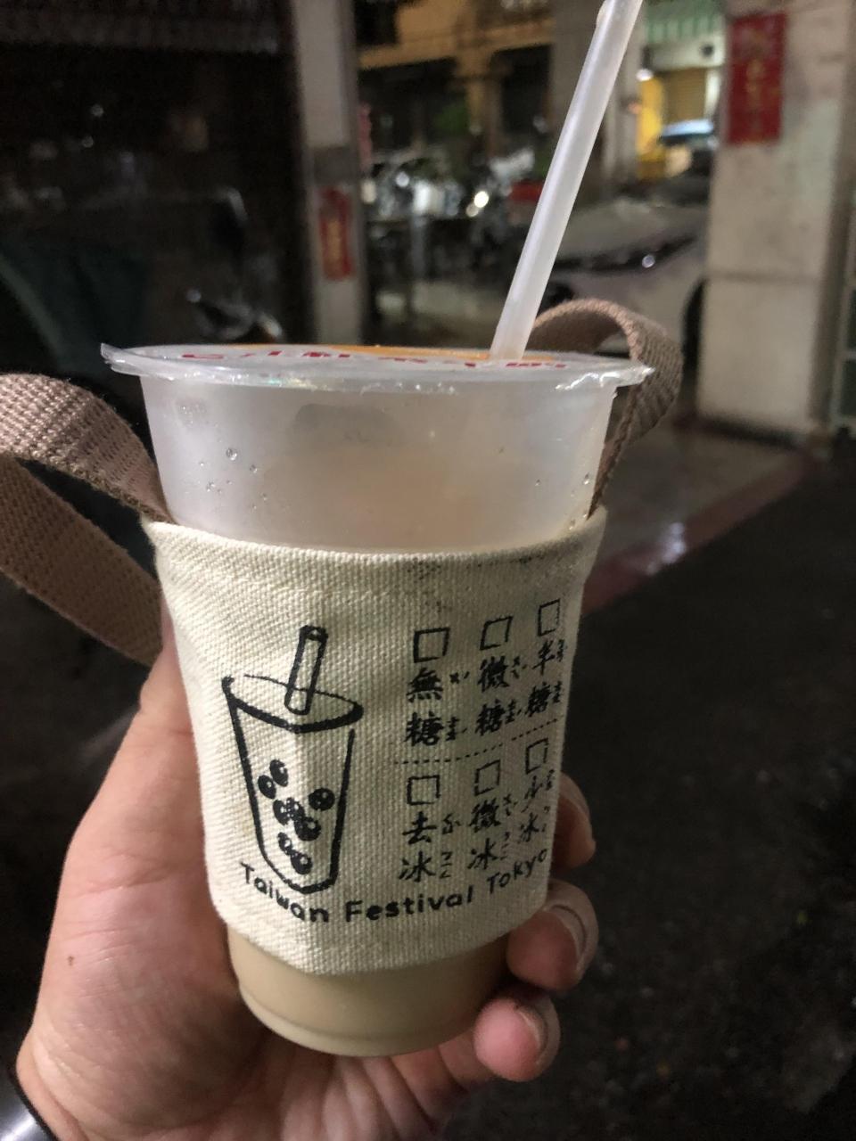 手提げ飲み物③ ホテル近くの老舗の老江紅茶牛奶屋さん、敢えてタピオカは入れませんでした。砂糖は少なめが基本です。