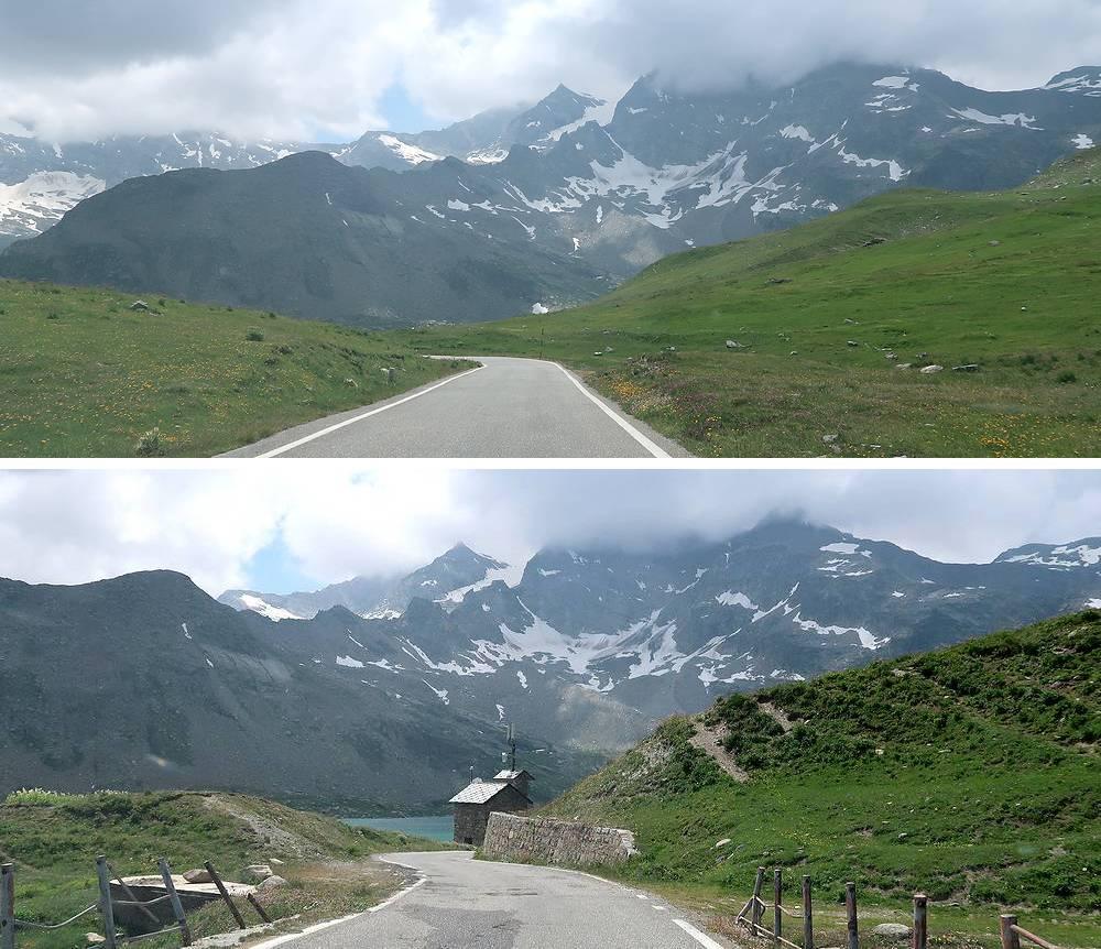 12時半過ぎには予約したホテルのある町チェレゾーレ・レアーレに到着。ホテルには寄らずにそのまま峠に向かうことにした。町を過ぎるとチェレゾーレ湖がきれいに見えた。湖の色がきれいな時間帯だったので、下りて撮影しておけばよかったと後で悔いた。