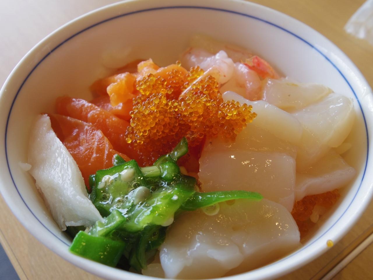 なんといっても目玉はお刺身。いくらこそないものの、おいしいホタテをたっぷり乗せた海鮮丼にしていただく。海老も甘ーい。