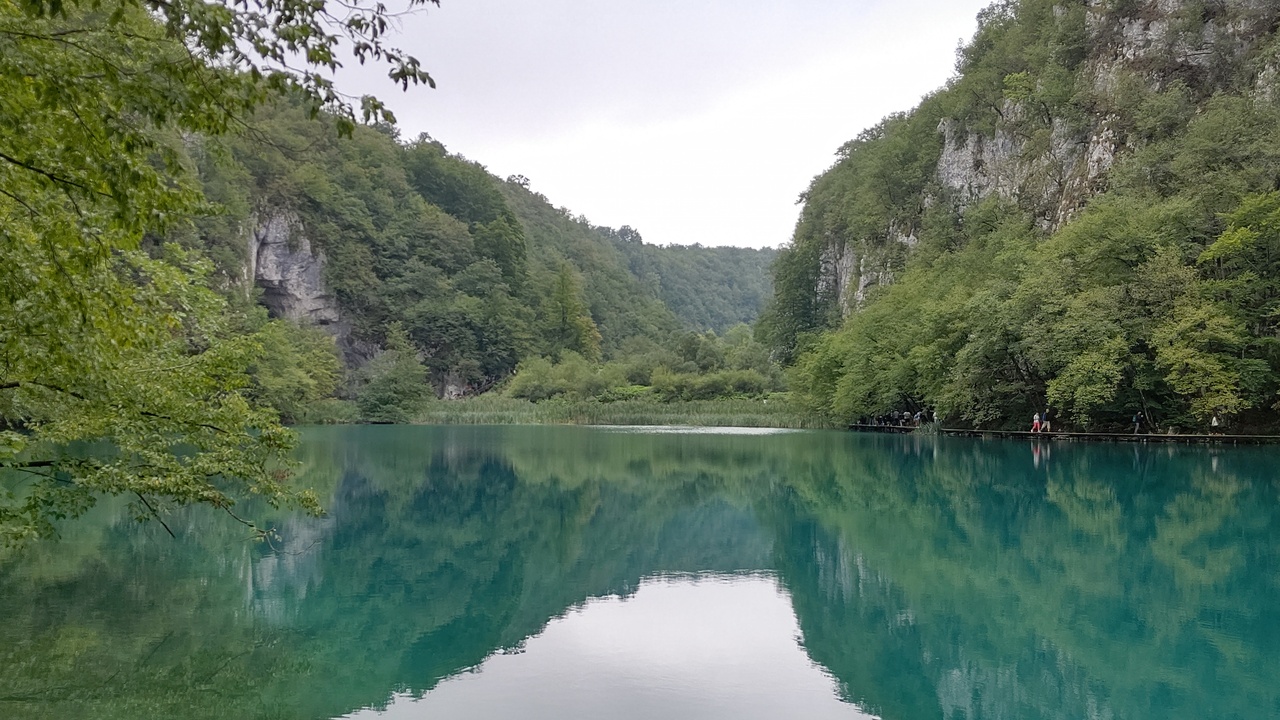 つづら折りの道を降りて水面近くまできました。こんなにきれいな湖を見たことがありません!