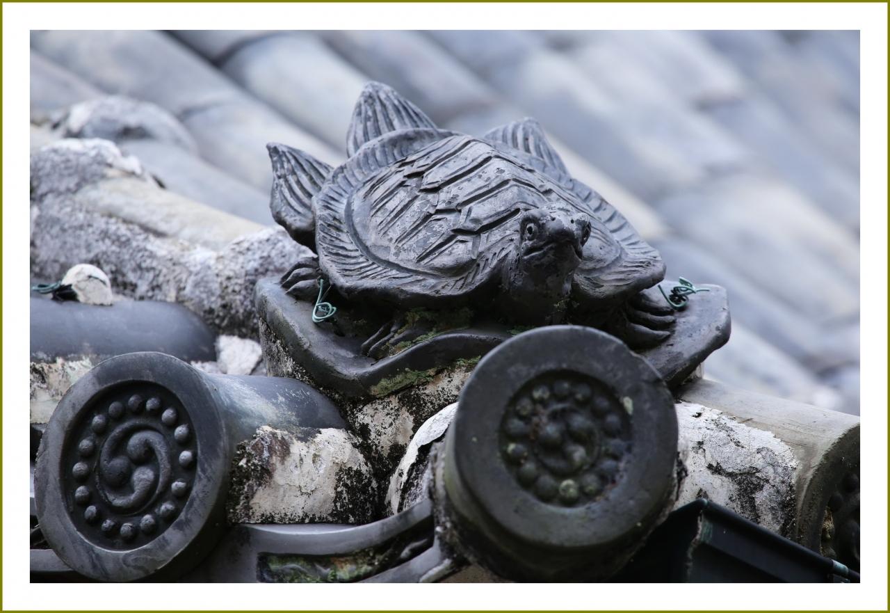 胡堂の屋根の隅に亀 -