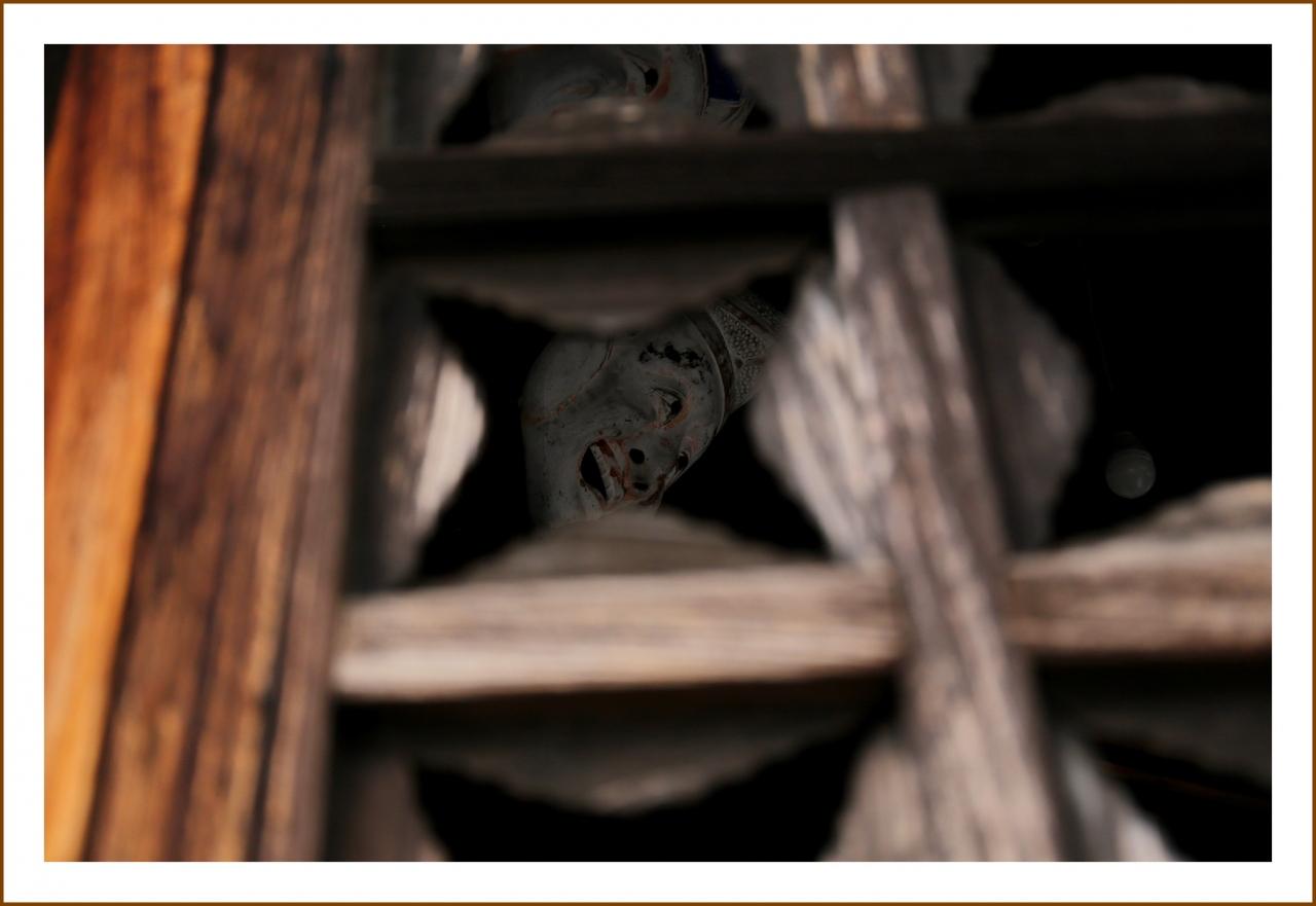お堂の中にお面がかけてある・・・。 -