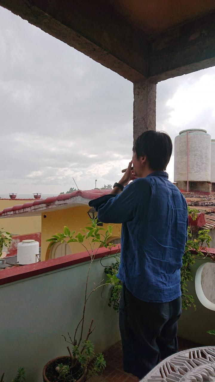 午前中にHavanaで購入したシガーで至福の時の夫。 -