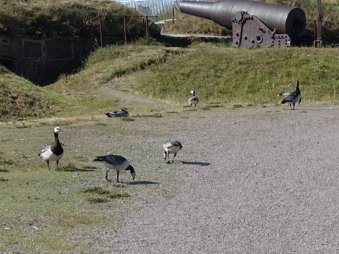 海沿いの道を行くと、大砲の手前に大きな鳥がたくさん。